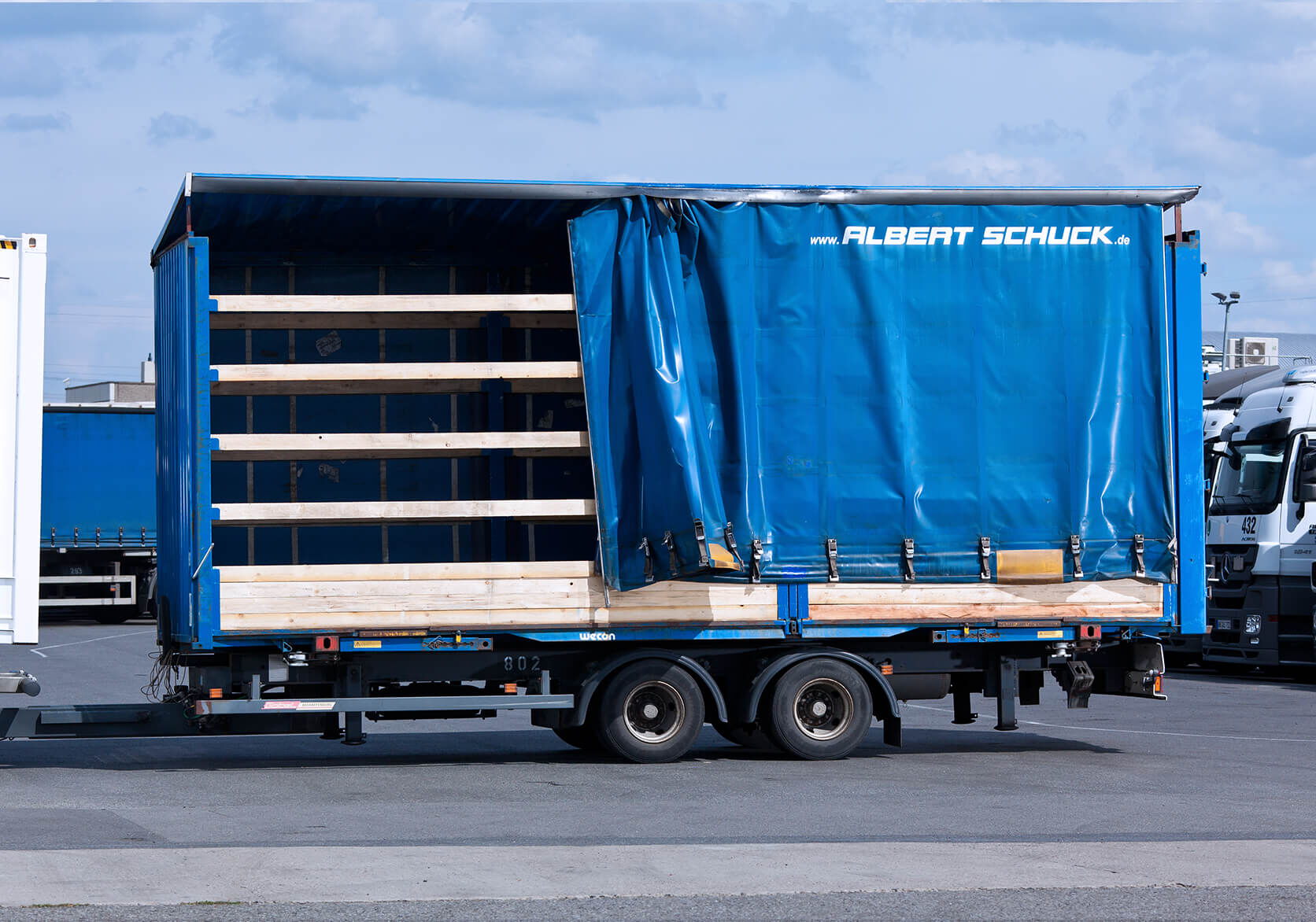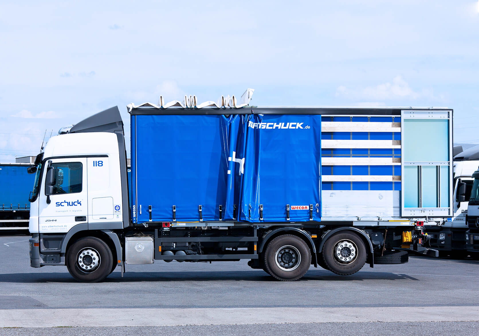 z drzwiami skrzydłowymi, boczną plandeką przesuwną, burtami i dachem typu EDSCHA (do szybkiego i łatwego załadunku żurawiem)
