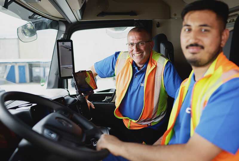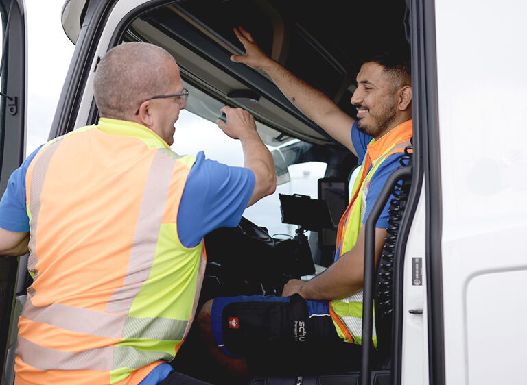 Fiecare șofer beneficiază la noi de o instruire detaliată cu privire la siguranța încărcăturii, transportul bunurilor periculoase, protecția muncii (instruire cu privire la siguranță, conducerea economică, managementul avariilor), precum și cu privire la timpii de conducere și de pauză. Din acest pachet face parte și un exemplar tipărit al manualului șoferului – „Șofer 1x1” –, pe care îl parcurgem împreună. În acest manual sunt explicate toate informațiile importante cu privire la procedurile noastre de lucru. În funcție de sarcini, aprofundăm cunoștințele șoferilor noștri în domenii individuale de aplicare, prin intermediul instrucțiunilor speciale cu privire la respectivele proceduri.