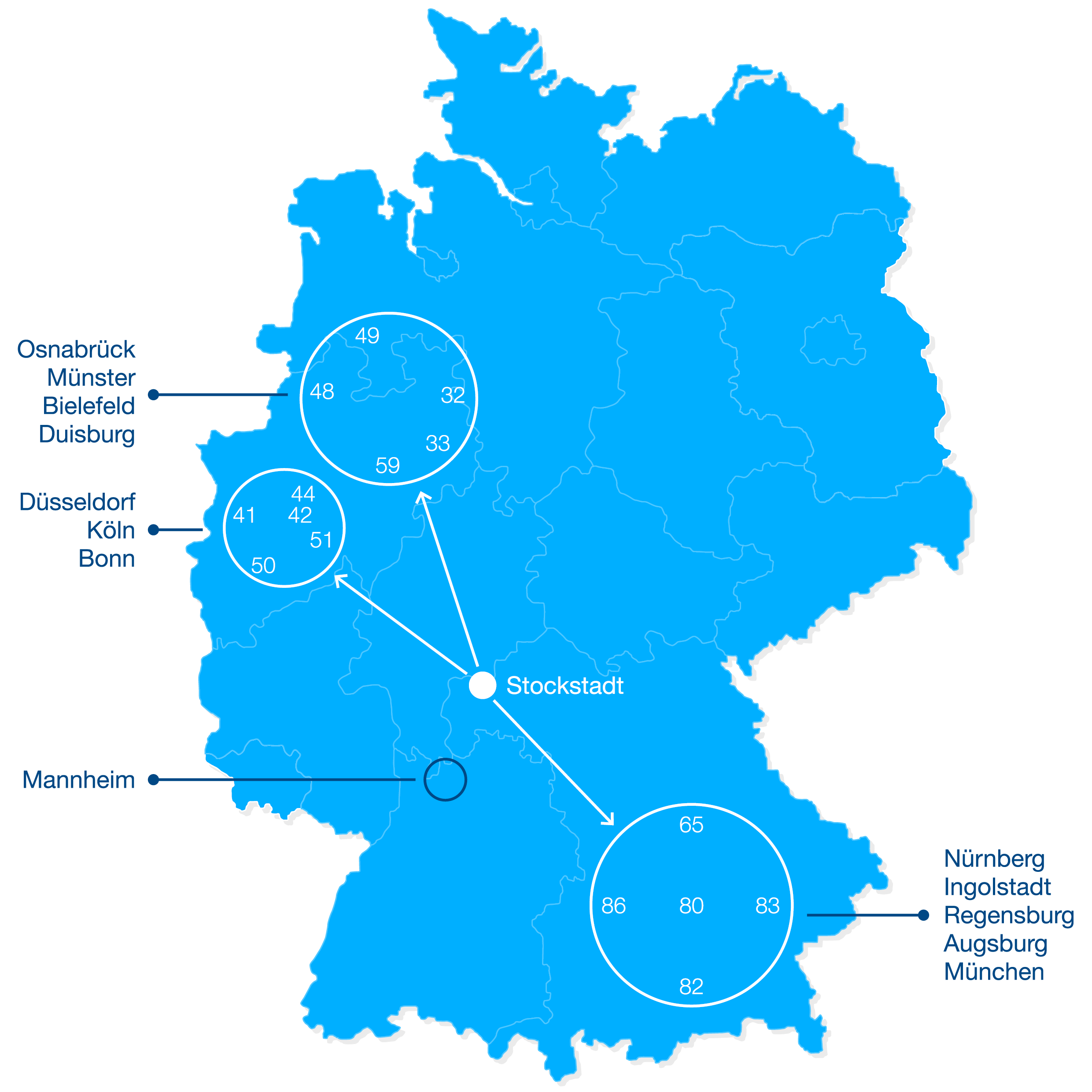 Jako przewoźnik neutralny realizujemy własny transport liniowy – częściowy i całopojazdowy – w Niemczech południowych, zachodnich i północnych. Codziennie obsługujemy następujące kierunki: